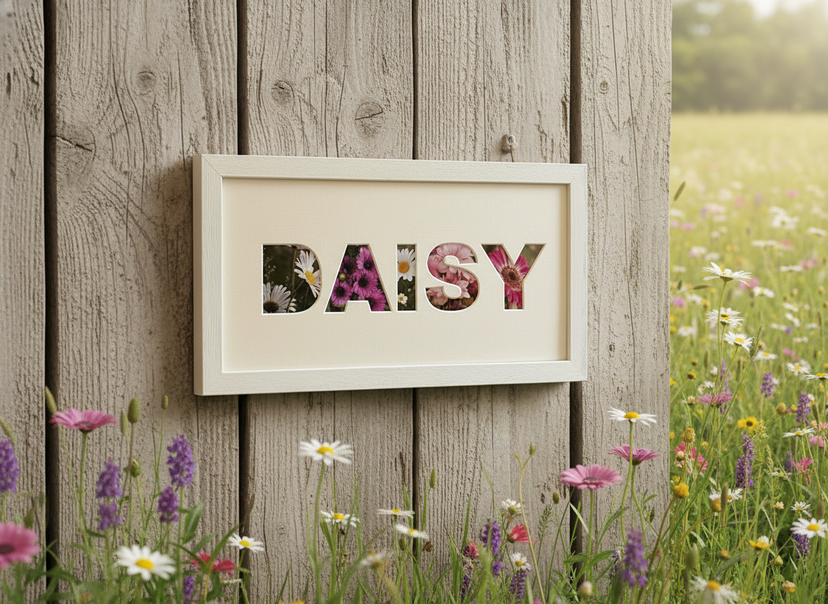 Name Frame in 22mm x 22mm open grain FSC wooden frame. Acrylic 2mm glazing with a white core PH neutral mount board. Ready to hang on the wall. 400mmx200mm image size.