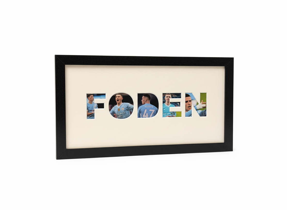 Name Frame in 22mm x 22mm open grain FSC wooden frame. Acrylic 2mm glazing with a white core PH neutral mount board. Ready to hang on the wall. 400mmx200mm image size.
